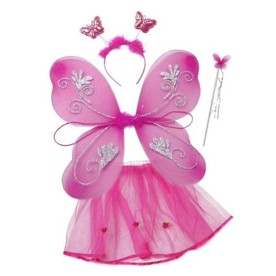 Komplet zawiera opaskę z motylkami, różdżkę, skrzydełka mocowane na gumce i spódniczkę tutu