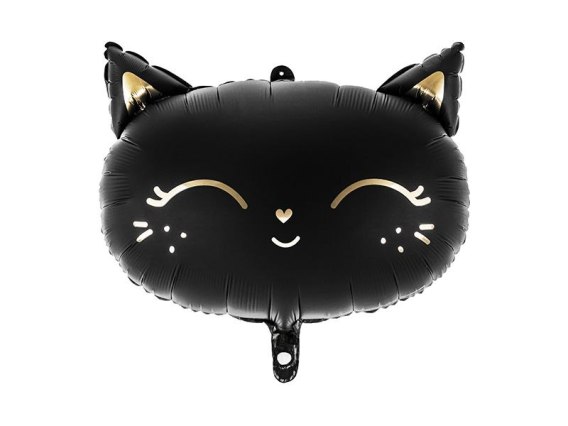 Matowy balon foliowy Kotek w czarnym kolorze ze złotymi metalizowanymi elementami, wymiary ok. 48 x 36 cm (19 x 14").