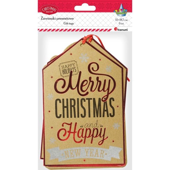 Zawieszki do prezentów wykonane z kartonu. W każdej zawieszce jest wycięty otwór na dowieszenie sznureczka. Tylna strona zawieszki nie posiada nadruku. Rozmiar MAXI!!! Aż 120 x 187 mm! 6 szt.