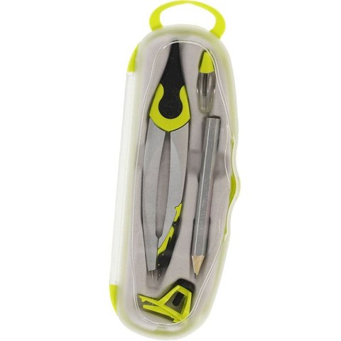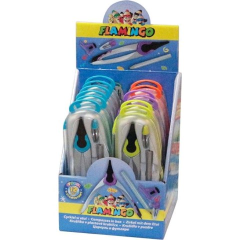 Szkolny cyrkiel metalowy w zestawie z wymiennymi wkładami grafitowymi, krótki ołówek drewniany i uchwyt do ołówka, płynnie regulowany rozstaw ramion, transparentne plastikowe etui. Dostępny w 4 kolorach. Kolory wydawane losowo.