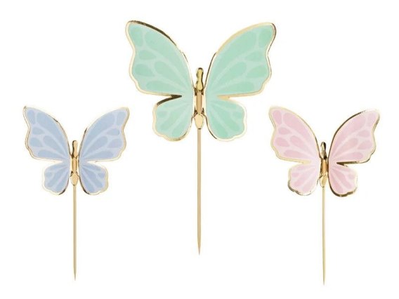 Toppery na tort Motylki, mix kolorów, zestaw zawiera 6 topperów na pikach w kolorach różowym, niebieskim i zielonym, szerokość ok. 9 cm, wysokość od ok. 6.5 cm. (1 op. / 9 szt.)