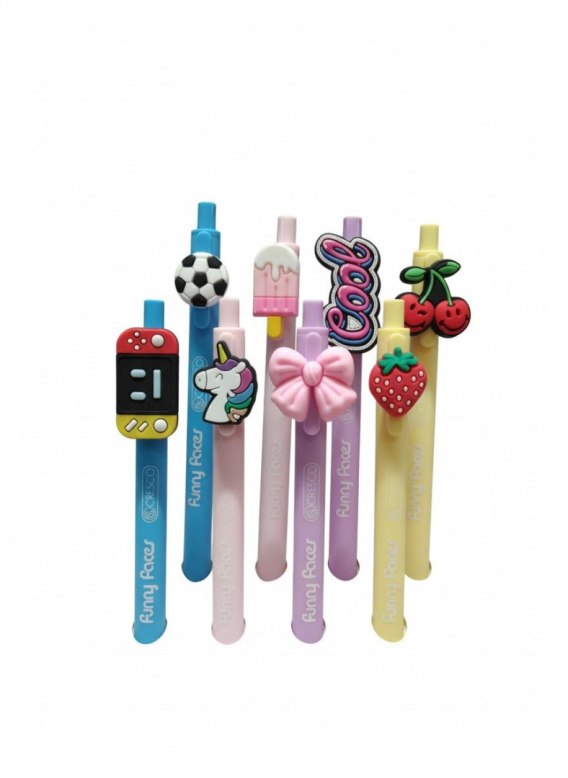 Długopis automatyczny Funny Faces to ciekawa propozycja dla najmłodszych.. Na klipsie znajdują się interesującie gumowe elementy, które wyróżniają nasze długopisy. Zarówno szeroka gama kolorystyczna jak i tematyczna sprawi, że każdy znajdzie ten jedyny dla siebie. W opakowaniu zbiorczym znajduje się mix 30szt.