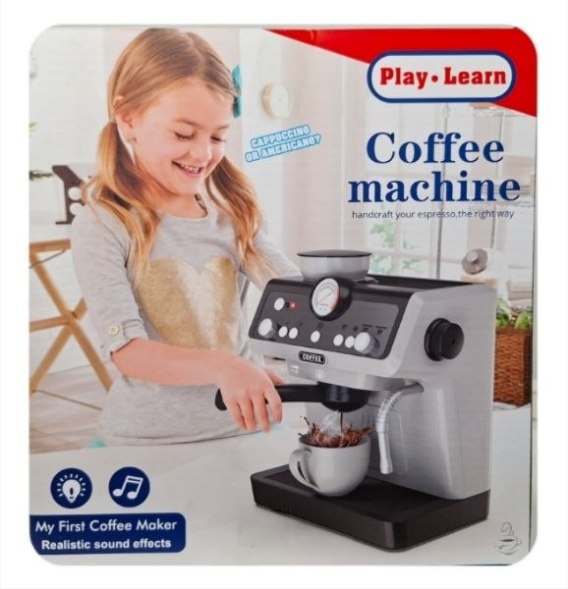 Zabawka w formie ekspresu do kawy z realistycznymi efektami dźwiękowymi oraz efektami świetlnymi. Zabawka działa na baterie typu AA. Baterie nie są załączone do zabawki. Produkt zapakowany w kartonowe pudełko. Podane wymiary są wymiarami opakowania. Zabawka przeznaczona dla dzieci od 3 lat.