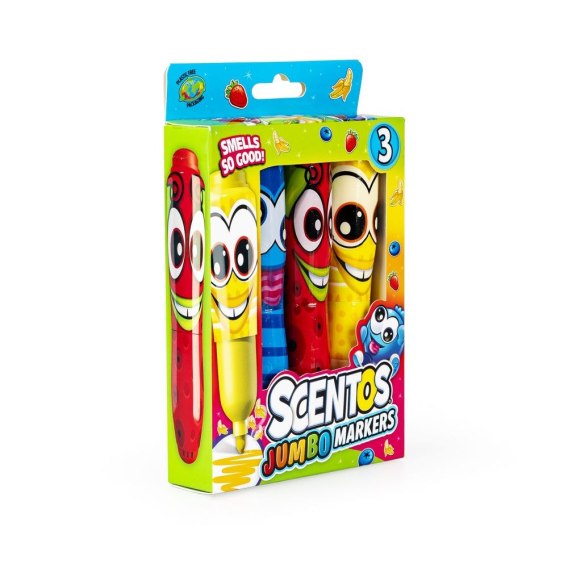 Wesołe buźki i pachnąca zawartość! Zestaw trzech grubych markerów zapewni podwójną przyjemność z pisania i rysowania. Markery różnią się zarówno kolorem, buźką, jak i zapachem. Każdy z nich nawiązuje do zapachu innego owocu.