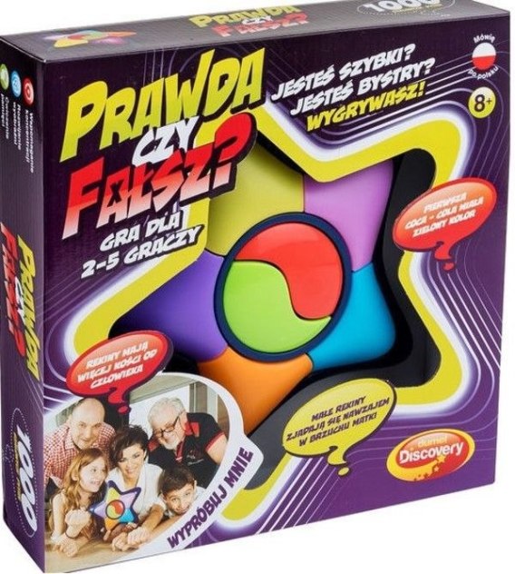 Wciągająca zabawa dla całej rodziny. Zapewni doskonałą rozrywkę zarówno dzieciom, jak i dorosłym. Zaskakująca gra znakomicie sprawdzi się podczas niejednej imprezy! Każdy, kto lubi dobrą zabawę szybko pokocha grę w "Prawdę czy fałsz". Wciągająca rozgrywka to udany przepis na każdy wieczór. Osobom, które szukają najlepszego pomysłu na spędzenie czasu w gronie bliskich, proponujemy właśnie tę wyjątkową grę. Sprawdź, czy dasz radę odpowiedzieć na zadawane pytania i zostań mistrzem! Innowacyjna gra zawiera w sobie ponad 1000 pytań z różnych kategorii. Są one ułożone w taki sposób, by zarówno młodsi, jak i starsi gracze mogli wspólnie się bawić. W "Prawdę czy fałsz" może grać od dwóch do pięciu graczy. Każdy z uczestników wybiera swój kolor, aby zyskać możliwość udzielenia odpowiedzi. Kiedy gracz uzna, że stwierdzenie wypowiedziane przez zabawkę jest prawdziwe, naciska zielony przycisk. W przypadku fałszu należy włączyć przycisk czerwony. Edukacyjną grę wygrywa osoba, która uzbiera największą ilość punktów. "Prawda czy fałsz" dostępna jest także w wersji dla najmłodszych. "Prawda czy fałsz. Junior" to doskonały pomysł na prezent dla Twojego dziecka.