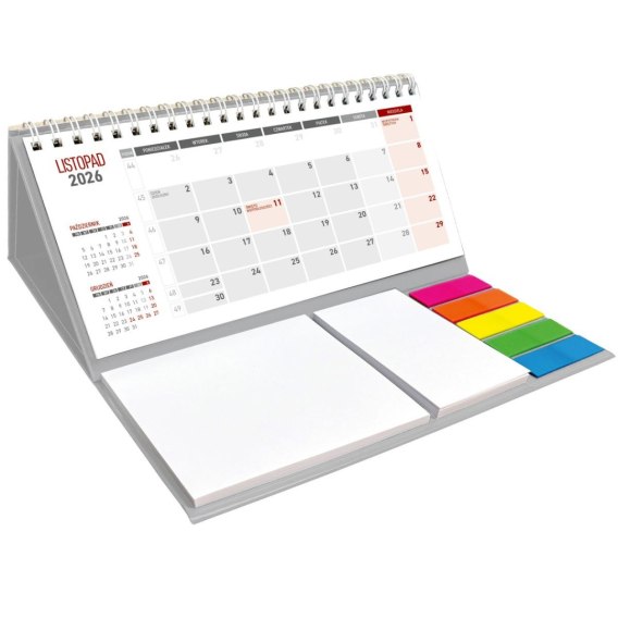 Wygodny kalendarz stojący na biurko z przejrzystym kalendarium w układzie miesięcznym z poręcznymi karteczkami samoprzylepnymi do notowania. Przydatny zwłaszcza w biurze. W kalendarzu zaznaczono święta. Kalendarium spiralowane.