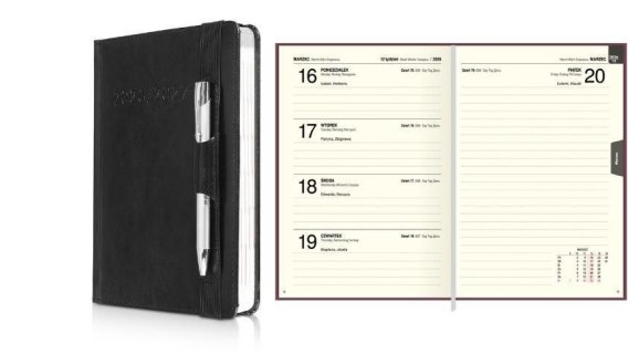 Perforowane narożniki umożliwiają szybkie odnalezienie bieżącej daty. Wewnątrz znajdziesz również tasiemkę do zaznaczania stron oraz strony dodatkowe na notatki, telefony kierunkowe, skorowidz alfabetyczny, imieniny i święta.