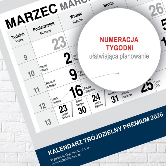 Kalendarz Trójdzielny Premium jest niezastąpionym narzędziem dla każdego, kto pragnie mieć swoje terminy pod pełną kontrolą. Kalendarz został starannie zaprojektowany, by oferować nie tylko pełen przegląd bieżącego miesiąca, ale również umożliwiać łatwe śledzenie poprzednich wydarzeń, dzięki prezentacji trzech miesięcy na jednej stronie - bieżącego i dwóch poprzednich (Układ kalendarium: 3 miesiące - 1 kartka). Przesuwane okienko umożliwia intuicyjne zaznaczanie i śledzenie poszczególnych dni, co czyni go wyjątkowo praktycznym w codziennym użyciu. Kalendarz jest wyposażony w wytrzymałą dziurkę, która umożliwia proste i bezpieczne zawieszenie go na ścianie, gwarantując, że będzie on zawsze pod ręką i w zasięgu wzroku. Idealnie sprawdzi się zarówno w domowym gabinecie, jak i w dynamicznym środowisku biurowym, gdzie szybki dostęp do informacji o dacie jest niezbędny. Dodatkowo, kalendarz jest opakowany w folię w celu ochrony przed uszkodzeniami podczas transportu, zapewniając, że dotrze do Ciebie w idealnym stanie. Produkt jest dostępny w formacie 310 x 790 mm, co zapewnia jego czytelność i wygodę użytkowania.