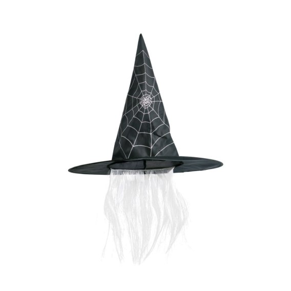Czarny z białą pajęczyną i pająkiem oraz białymi włosami. Średnica kapelusza 38 cm, wysokość: 33cm.