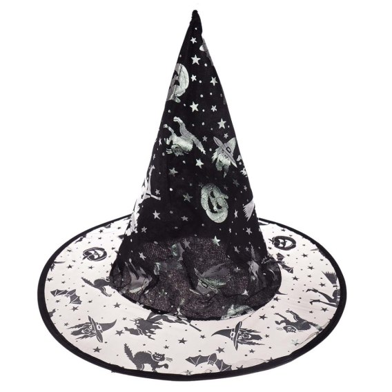 Kapelusz czarownicy z transparentnym rondem Wymiary: 38 × 32 cm 1 sztuka Stylowy kapelusz czarownicy z szerokim, transparentnym rondem i dekoracyjnym nadrukiem to idealny dodatek do halloweenowych przebieranek. Kapelusz wykonany jest z lekkiego, lekko usztywnianego materiału na rondzie, dzięki czemu zachowuje kształt i dobrze prezentuje się na głowie. Charakterystyka produktu: - Wzory: pajęczyny, nietoperze, gwiazdy, dynie, czarownice (mix wzorów). - Kolory nadruku: metaliczne - złoto, srebro. - Rondo: szerokie i prześwitujące, z efektownym nadrukiem. - Materiał: lekka tkanina syntetyczna, półsztywna konstrukcja. - Wymiary: wysokość 38 cm, średnica ronda 32 cm. - Rozmiar uniwersalny - odpowiedni dla dzieci, młodzieży i dorosłych. Zastosowanie: - Halloweenowe przebrania czarownicy, czarodzieja lub maga. - Imprezy tematyczne, animacje, bale przebierańców. - Imprezy andrzejkowe. - Dekoracja pomieszczenia lub ekspozycji sklepowej. - Sesje zdjęciowe w klimacie fantasy lub grozy. Kapelusz z transparentnym rondem nie tylko dopełni Twoją stylizację, ale też doda jej elegancji i lekkości. Wzory pięknie połyskują w świetle - efekt gwarantowany! Wyrób nie jest zabawką. Ostrzeżenie. Trzymać z dala od ognia.