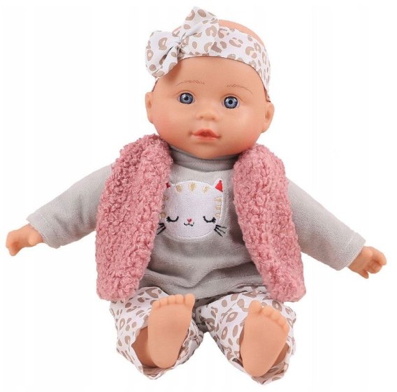 Lalka Julka lubi, kiedy się nią opiekujesz i zabierasz ze sobą na spacery. Miękka lalka jest ubrana w opaskę z kokardką, welurową bluzeczkę, spodnie w panterkę oraz miękką, wełnianą kamizelkę.