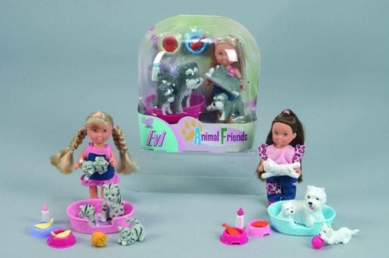 Tutaj Evi zajmuje się swoimi czworonogami. W zestawie znajdziemy lalkę Evi, cztery zwierzaki, leżankę, miski na pokarm, butelki na mleko i zabawki. Produkt przeznaczony dla dzieci od 3 lat. Towar występuje w kilku losowo wybranych wersjach.