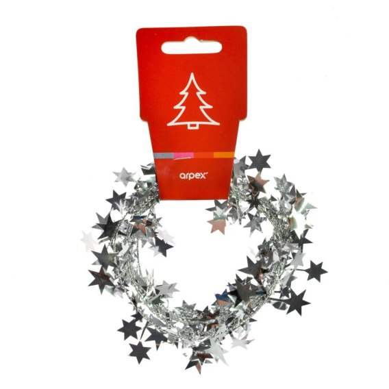 Łańcuch dekoracyjny z wystającymi gwiazdkami. Uniwersalna dekoracja świąteczna na choinkę, do dekoracji domu, stroików. Łańcuch jest elastyczny, dzięki temu, że w całości jest na druciku można go bardzo łatwo dopasowywać do różnych aranżacji. Łańcuch w kolorze srebrnym o długości 270 cm.