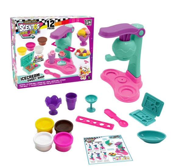 Cechy produktu: - w zestawie 12 elementów: zabawkowa maszynka do tworzenia ciastolinowych lodów, 3 zabawkowe naczynia do serwowania, 1 zabawkowa łyżka, 1 zabawkowa miseczka, wytłaczarka, foremka z kształtami owoców i 4 kubeczki z pachnącą ciastoliną (w różnych kolorach); - wiek: 3+