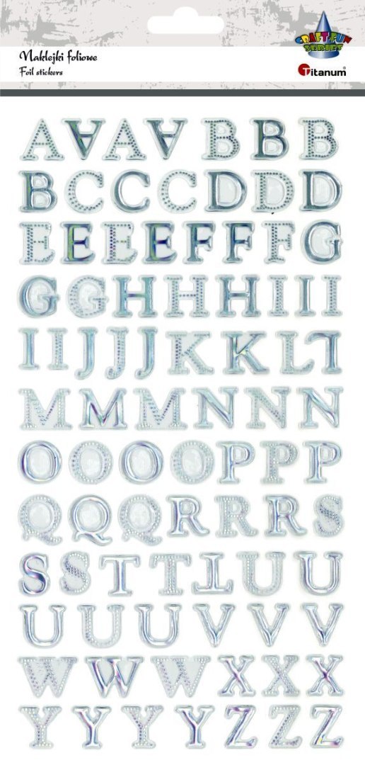 Naklejki foliowe, wzór: alfabet, kolor: srebrny, wysokość liter: 18 mm. 85 sztuk.