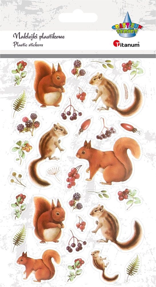 Naklejki foliowe, wzory: wiewiórki, kiście owoców, mix. 32 sztuki.