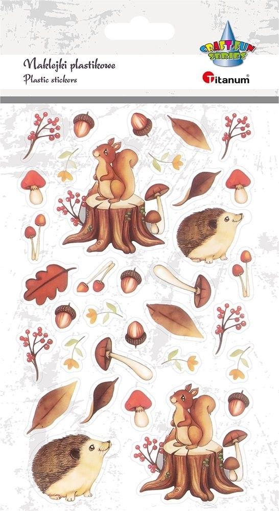 Naklejki foliowe, wzory: wiewiórki, jeże, żołędzie, grzyby, jarzębina, mix. 34 sztuki.