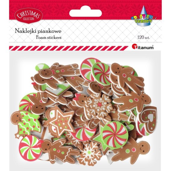 Naklejki piankowe imitujące piernikowe ciasteczka. Kształty : chłopczyk, dziewczynka, domek, lizak, gwiazdka, serce, śnieżynka, choinka, cukrowa laska. Kolor: brązowo-zielono-czerwono-biały. Wymiary: miks. Ilość: 120 szt.