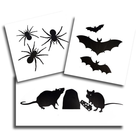 Dekoracje ścienne ze zwierzętami do wyboru: myszami, pająkami lub nietoperzami. Są to naklejki, które z łatwością można umieścić na ścianie, oknie lub lustrze. Straszydła doskonale sprawdzą się do dekoracji przyjęć z okazji Halloween oraz imprez tematycznych. W opakowaniu znajduje się 12 sztuk naklejek.