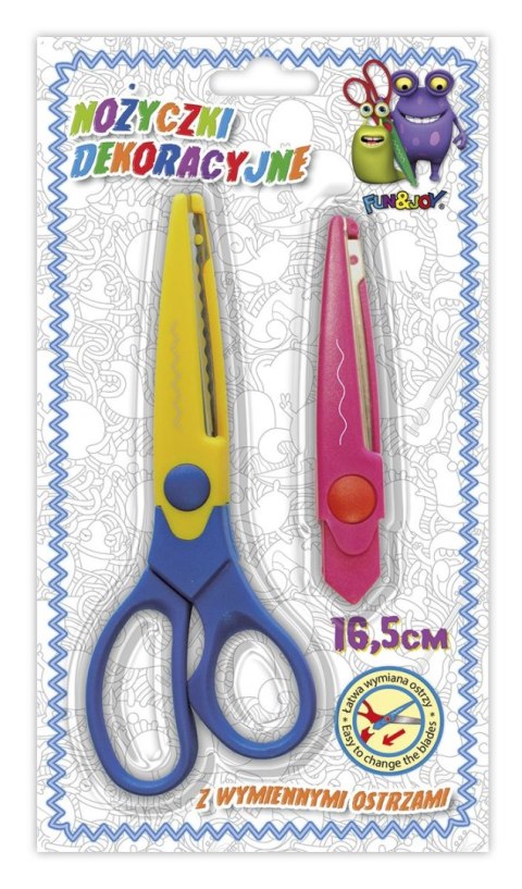 Nożyczki dekoracyjne do wycinania fantazyjnych wzorów. Ostrza wykonane ze stali nierdzewnej a uchwyt nożyczek z mocnego, trwałego plastiku. Długość nożyczek: 16,5 cm. W komplecie nożyczki i 1 wymienne ostrze z innym wzorem cięcia.