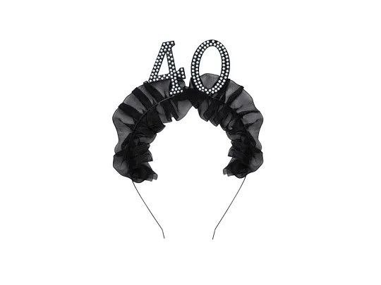 Opaska z czarną, materiałową falbanką oraz liczbą 40 udekorowaną perełkami. Rozmiar całościowy ok 12 x 19,5 cm. Wysokość samej liczby ok. 5,3 cm