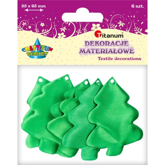 Dekoracje materiałowe. Kształt: choinki. Kolor: zielone. Wymiar: 55 x 65 mm. Opakowanie: 6 szt.