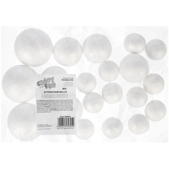 Zalety produktu: do decoupage, można je ozdabiać na różne sposoby, styropian tworzy ciekawy efekt przy różnego rodzaju pracach plastycznych. Styropianowe bombki od CRAFT WITH FUN idealnie nadają się do sztuki decoupage oraz innych kreatywnych dekoracji. Używaj tego produktu w połączeniu z innymi akcesoriami oraz kompletami z serii CRAFT WITH FUN Zawartość opakowania: 20 styropianowych bombek: mała 12 szt-średnica 2,5cm; średnia 5 szt-średnica 3,5cm ; duża 3szt-średnica 4,5cm. Wymiary/waga: wymiary opakowania dł. x wys. x gł. cm : 14x22x5, waga produktu w opakowaniu kg : 0,02 kg. Zestaw przeznaczony dla dzieci w wieku: 3 . Pakowany w woreczek. Mała- 12szt, średnia 2,5cm W inerze po 12 szt. W kartonie zbiorczym po 48 szt.