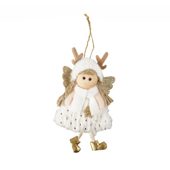 Świąteczna zawieszka dekoracyjna w kształcie aniołka. Dostępna w trzech wariantach kolorystycznych - białym, różowym oraz szarym. Ozdoba zawiera błyszczące elementy brokatowe. Sukienka oraz czapeczka aniołka została wykonana z materiału imitującego futerko. Nóżki są ze sznurka, nieusztywnione. Dekoracja zawiera sznurek umożliwiający powieszenie ozdoby. Wymiar zawieszki: 15 cm.