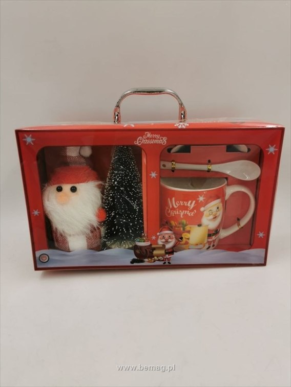 Zestaw prezentowy świąteczny kubek z talerzykiem ,łyżeczką figurką Mikołaja i choinką w pudełku A5396