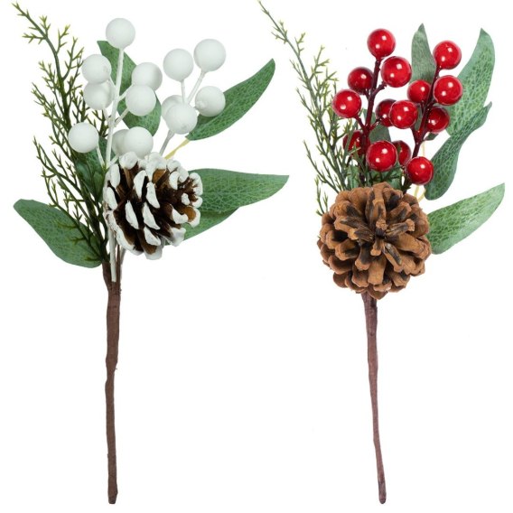 Zimowa gałązka dekoracyjna. Kompozycja złożona z listków, kuleczek imitujących jagody w kolorze czerwonym lub białym oraz szyszki. Może służyć jako samodzielna ozdoba lub wypełnienie kompozycji dekoracyjnych, stroików oraz sztucznych kompozycji kwiatowych. Gałązka o długości około 22 cm.