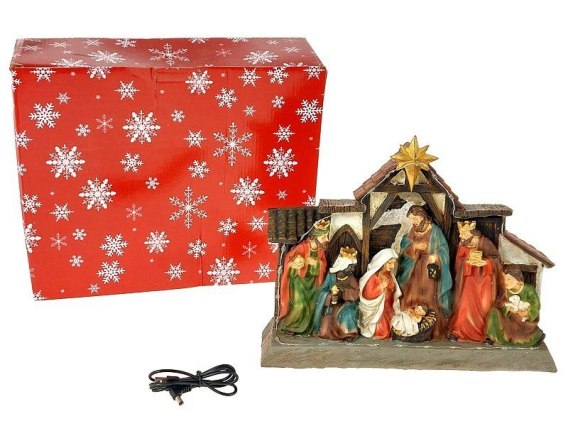 Szopka ze światłem LED i muzyką, 33x25x8cm, z kablem USB; 37x31x12cm, Box