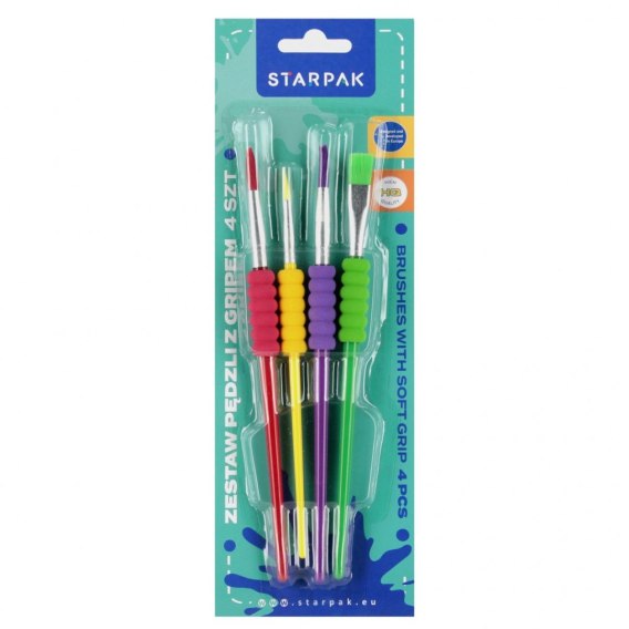 Zalety produktu: Zestaw pędzli szkolnych z gripem 4 sztuki STARPAK. dualny zestaw dla małych artystów Pędzle szkolne z wygodnym gripem zapewniają komfort i kontrolę podczas malowania. Różne rozmiary i kształty końcówek pozwalają na tworzenie zarówno precyzyjnych detali, jak i szerszych pociągnięć. Świetny do szkoły, zajęć plastycznych i domowych projektów, lekka trwała rączka, dopasowana do dziecięcej dłoni, miękkie, syntetyczne włosie, idealne do farb wodnych, plakatowych i akwareli, antypoślizgowy grip, gwarantuje wygodny chwyt i lepszą kontrole nad precyzyjnością malowania pędzlem. Zestaw zawiera 4 pędzle o różnych grubościach. Produkt pakowany na blistrze. Nieodpowiedni dla dzieci poniżej 3 roku życia. Wymiary/waga: Wymiary opakowania wys. x szer. x gł. cm 27x9x2, waga opakowania kg. 0,08 kg. Wymiary produktu dł. cm -od 17cm do 19cm, waga produktu kg. 0,05kg. Pakowanie iner 24 szt. W kartonie zbiorczym 48 szt.