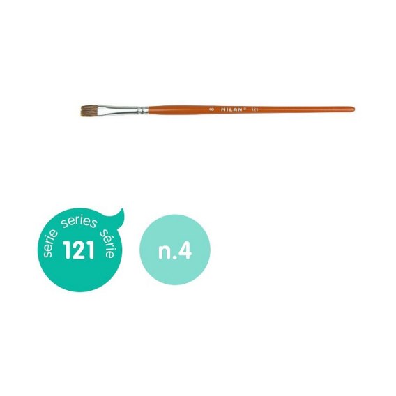 Szkolny płaski pędzel serii 121 nr 4 z krótkim drewnianym trzonkiem. Skład: 70% naturalnego włosia koziego + 30% syntetyczne. Brązowe lakierowane wykończenie i aluminiowa skuwka bez spawania, odporna na rdzewienie. Bardzo miękkie włosie idealne do technik akwarelowych, wodnych i plakatowych. Lepsze zatrzymanie wody i farby. Gładsza linia. Lepsza odporność i elastyczność, co ułatwia odzyskanie kształtu po jego użyciu. Szerokość włosia: 5,2 mm. Grubość włosia: 2,4 mm. Długość włosia: 7,8 mm. Długość pędzla: 181 mm.