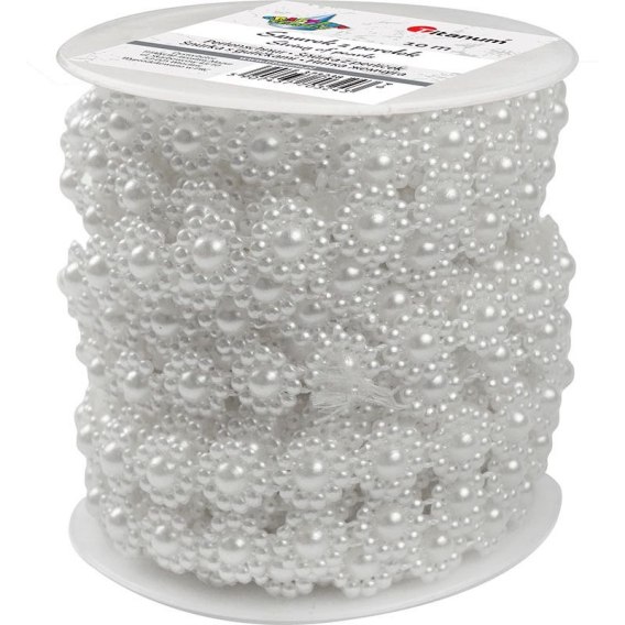 Perełki na sznurku, wykonane z plastiku, z jednej strony są płaskie, dzięki czemu można je przyklejać. Nie przesuwają się po sznurku, można je dowolnie przycinać. Długość: 10 m, kolor: białe perłowe.