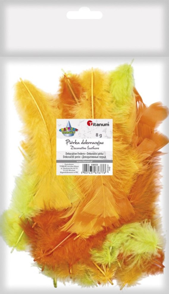 Piórka dekoracyjne, kolory: bladozielony, żółty, pomarańczowy. Blister 8 g.