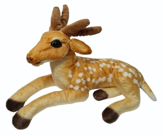 Pluszowa sarenka leżąca, w naturalnych kolorach z białymi plamkami. Miękka i przyjemna w dotyku, idealny do przytulania lub jako dekoracja pokoju dziecięcego. Zabawka przeznaczona dla dzieci od pierwszych dni życia.