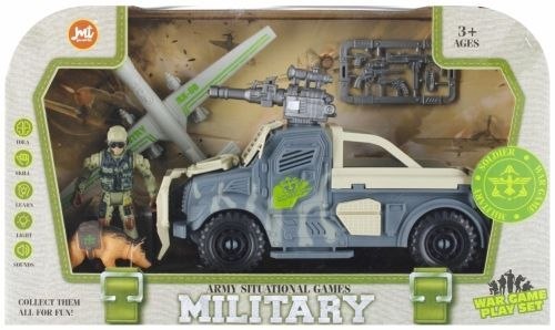 Zalety produktu: posiada ruchome elementy, posiada efekty dźwiękowe oraz świetlne. Wojskowy samochód do działań specjalnych od MEGA CREATIVE! Zawsze gotowy do działania na wypadek wybuchu wojny! Zawartość zestawu: samochód wojskowy, figurka żołnierza, figurka psa, samolocik. Wymiary/waga/baterie: wymiary produktu (dł. x wys. x gł.) [cm]: 23x13x8, wymiary opakowania (dł. x wys. x gł.) [cm]: 37x21x9, waga produktu bez opakowania [kg]: 0, 26 kg, waga produktu w opakowaniu [kg]: 0,37 kg, wymaga zasilania bateriami 3 x AG13- załączono do zestawu. Zestaw przeznaczony dla dzieci w wieku: 3+. Pakowany w kartonik z okienkiem. W kartonie zbiorczym po 24 szt.
