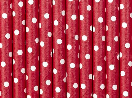 Słomki papierowe w kolorze czerwonym z białymi małymi kropkami, długość około 19,5 centymetra.