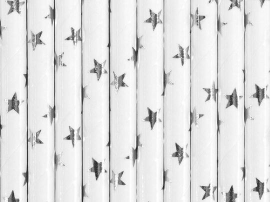 Słomki papierowe w kolorze białym, ze srebrnymi metalizowanymi gwiazdkami, długość ok. 19.5 cm. Towar nie może być sprzedawany na terytorium RFN i Szwajcarii, w związku z wewnętrznymi regulacjami prawnymi Niemiec i Szwajcarii. Towar zgodny z przepisami Unii Europejskiej.
