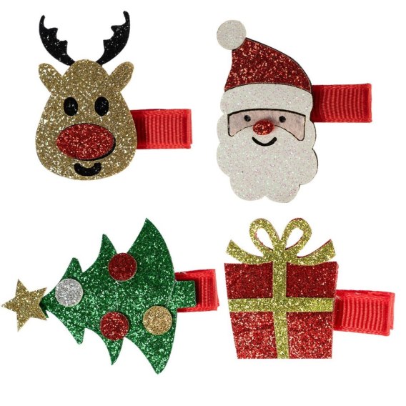Spinki do włosów ze świątecznymi motywami. Elementy pokryte brokatem pięknie się mienią w świetle. Idealny mały świąteczny dodatek do stroju na Mikołajki lub święta. Wymiary produktu: 3x3, 5-4 cm. W opakowaniu znajdują się 2 spinki.