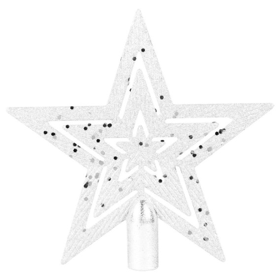 Szpic dekoracyjny na choinkę w kształcie gwiazdy w kolorze białym. Błyszcząca gwiazda pokryta drobnym brokatem z elementami dużych płatków brokatu. Pięknie mieni się posród blasku choinkowych lampek. Uniwersalna dekoracja choinki pasująca do innych ozdób. Dopełnia finalną dekorację świątecznego drzewka. Gwiazda o wymiarze 20 cm. Produkt wykonany z wytrzymałego tworzywa sztucznego.