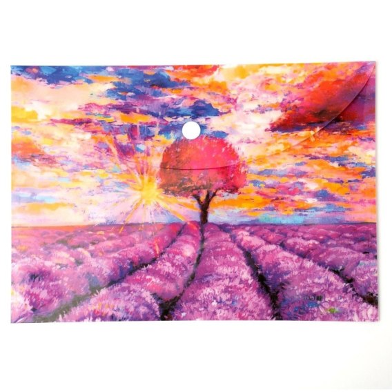 Ozdobna teczka kopertowa VISTA, wykonana z trwałego polipropylenu z nadrukiem w postaci impresjonistycznego pola lawendy. Zamykana na zatrzask typu napa. Dzięki pełnemu zadrukowi, zawartość teczki pozostaje niewidoczna na zewnątrz. Idealne rozwiązanie do przechowywania dokumentów lub niewielkich płaskich przedmiotów.