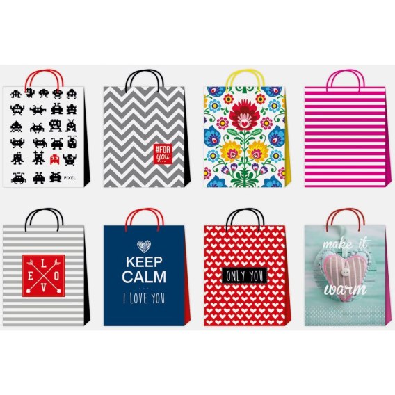 Mała torebka prezentowa o wym. 200x250x100 mm w 8 wzorach na każdą okazję. Pokryta lakierem hybrydowym. Produkt wysokiej jakości.