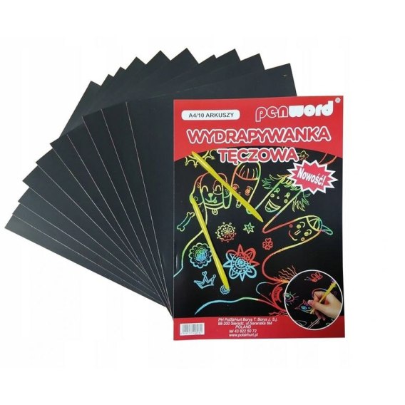 Wydrapywanka hologramowa opakowanie posiada 10 arkuszy o wymiarach 29cm x 20cm zbliżone do rozmiaru A4. Dodatkowo w zestawie znajduje się rysik dzięki któremu możemy wydrapywać naniesioną czarną farbę na hologramowym arkuszu.