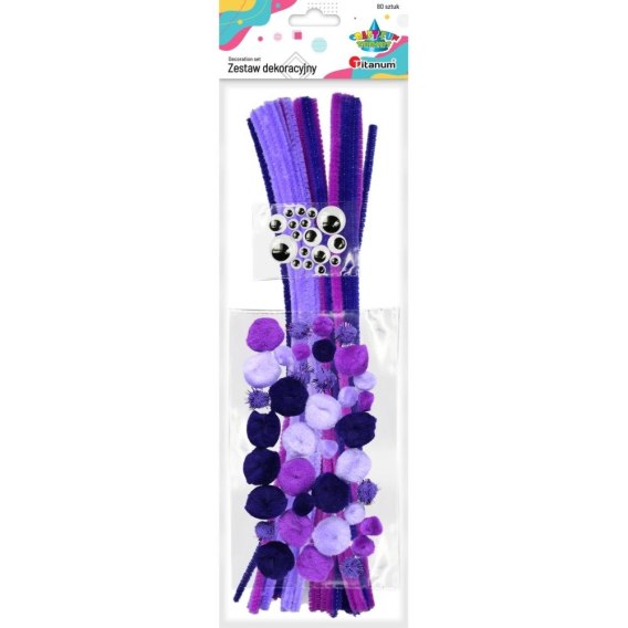 Zestaw: druciki, pompony, oczka, tonacja: odcienie fioletu. 80 szt.