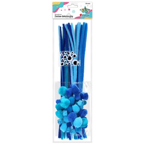 Zestaw: druciki, pompony, oczka, tonacja: niebieska. 80 szt.