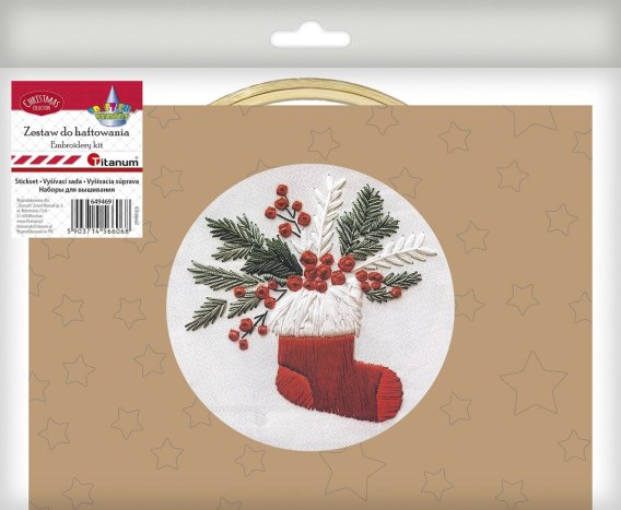 Gotowy zestaw do haftowania, zawierający: tkaninę 24x24 cm ze szkicem wzoru, tamborek o średnicy roboczej 15 cm, zestaw mulin, 3 igły, instrukcję w języku polskim. Wzór: świąteczna skarpeta.