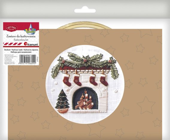 Gotowy zestaw do haftowania, zawierający: tkaninę 24x24 cm ze szkicem wzoru, tamborek o średnicy roboczej 15 cm, zestaw mulin, 3 igły, instrukcję w języku polskim. Wzór: świąteczny kominek.