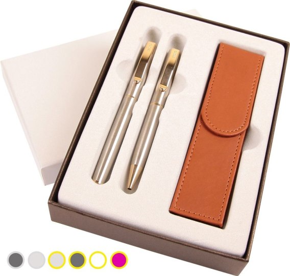 Komplet składa się z pióra wiecznego metalowego wyposażonego w grawerowaną stalówkę irydową grubości F, na standardowe naboje atramentowe oraz długopisu metalowego z wkładem typu parker (niebieski) o średniej grubości pisania z obrotowym mechanizmem wysuwania wkładu ; dostępny w 6 kolorach w wersji mat : czarny , srebrny , grafitowy, niebieski, zielony, czerwony ; pakowany w etui z grubego grafitowego kartonu , wewnątrz pudełka etui z czarnej skóry ekologicznej na dwa elementy