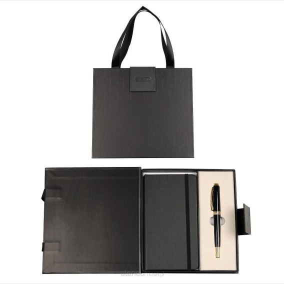 Zestaw prezentowy w ciekawym opakowaniu imitującym torebkę prezentową. Komplet zawiera notes z gumką i wstążką oraz eleganckie czarne pióro wieczne SYMPHONY ze złotymi wykończeniami. Zestaw upominkowy spakowany w kartonowe etui z zapięciem magnetycznym. Po zamknięciu opakowanie przybiera postać torebki prezentowej z uchwytami ze wstążki. Zatem po zakupie jest to gotowy prezent do wręczenia na różne okazje. a.